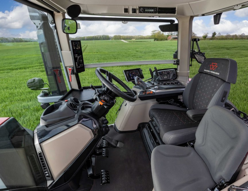 Hladina hluku, která dosahuje pouhých 68 dB(A) řadí tuto kabinu mezi nejtišší na trhu. Skleněná plocha kabiny o ploše 6,6 m² zajišťují panoramatický výhled v rozsahu 360. S výbavou Exclusive lze sedadlo řidiče otočit až v rozsahu -20° až +45°, což přináší maximální pohodlí. V prostorné kabině o objemu 3,4 m³ nově najdeme upravený volant a možnost multimediální výbavy. Nový bezdrátový terminál kompatibilní s Android Auto a Apple CarPlay je umístěn na pravé straně kabiny tak, aby nepřekážel jinému ovládání. V kabině můžeme najít DAB rádio, USB vstup, Bluetooth pro přístup ke službám mobilního telefonu, zásuvky pro mobil, elektricky nastavitelná a vyhřívaná zrcátka, automatická klimatizace jsou samozřejmostí. Displej má úhlopříčku 6,75" a lze jej ovládat dotykově nebo přes ovládací prvky na loketní opěrce traktoru. Pro nejlepší zvukový zážitek je zábavní balíček vybaven špičkovými reproduktory od značky Focal. Zábavní balíček je dostupný přes program MF By You – zákaznické centrum pro individualizaci traktorů Massey Ferguson